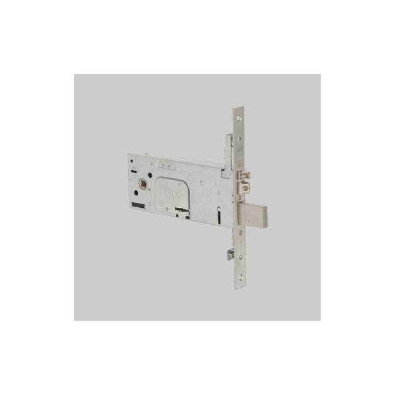 4 Mandate. Scatola e frontale con rivestimento in zinco. Catenaccio e borchia in acciaio. Piastra di protezione antiscasso. Predisposizione per chiusure supplementari. Coppia boccole filettate (M8). Scrocco o scrocco/pistone reversibili nichelati. Scrocco autobloccante. Intercambiabilita' fra la versione elettrica e quella meccanica. Funzione fermo a giorno che impedisce la chiusura del portone/cancello. Tensione 12V ca CE. Corrente assorbita 1,7A. Larghezza frontale 25 mm. Interasse 67 mm. 2 Chiavi in dotazione. Serratura doppia mappa per porte alluminio da fascia art. 17358 cisa e90 - scatola mm 185x78 CISA Serrature cisa