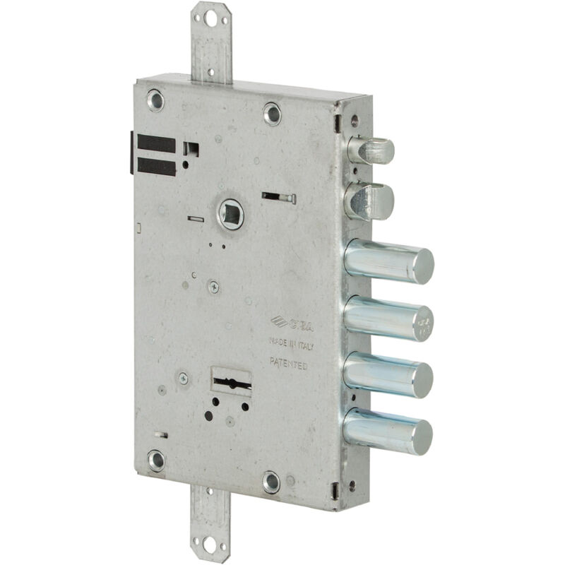 Doppia mappa. Scrocco e catenaccio. Scatola in acciaio, scrocco e catenaccio in acciaio zincato ad alta resistenza. Tensione 12V, scrocco autobloccante richiamabile elettronicamente. Fornita senza aste. Con tre chiavi più una di servizio.