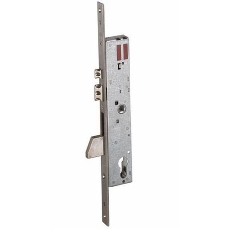 Per montanti - Zincata - Testata in acciaio inox - Una mandata e scrocco regolabile - Cilindro da ordinare a parte - Ambidestra - A richiesta contropiastra 06463.04/05/06/07/09/22 Tensione 12 Volt CA Misura 25 mm. Frontale 22 mm.