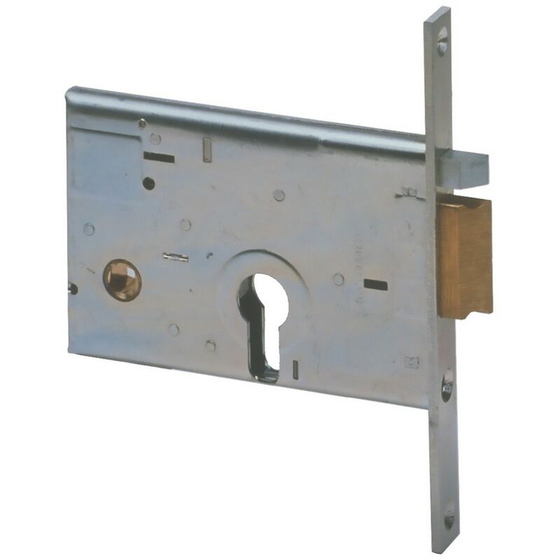 Foro cilindro europeo. scatola e frontale zincato. scrocco in ottone, altezza scatola 82 mm. tensione 12v, quadro maniglia mm 8. dotazione vite di fissaggio cilindro. senza cilindro.e58 dx - fr.mm 20/int.mm 48 scrocco