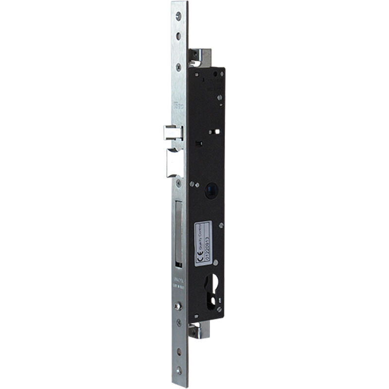 Chiusura triplice. Quadro maniglia mm 8, scrocco autobloccante. Dotata di due ghiere, un sottofrontale in nylon, viti di fissaggio. Frontale inox.