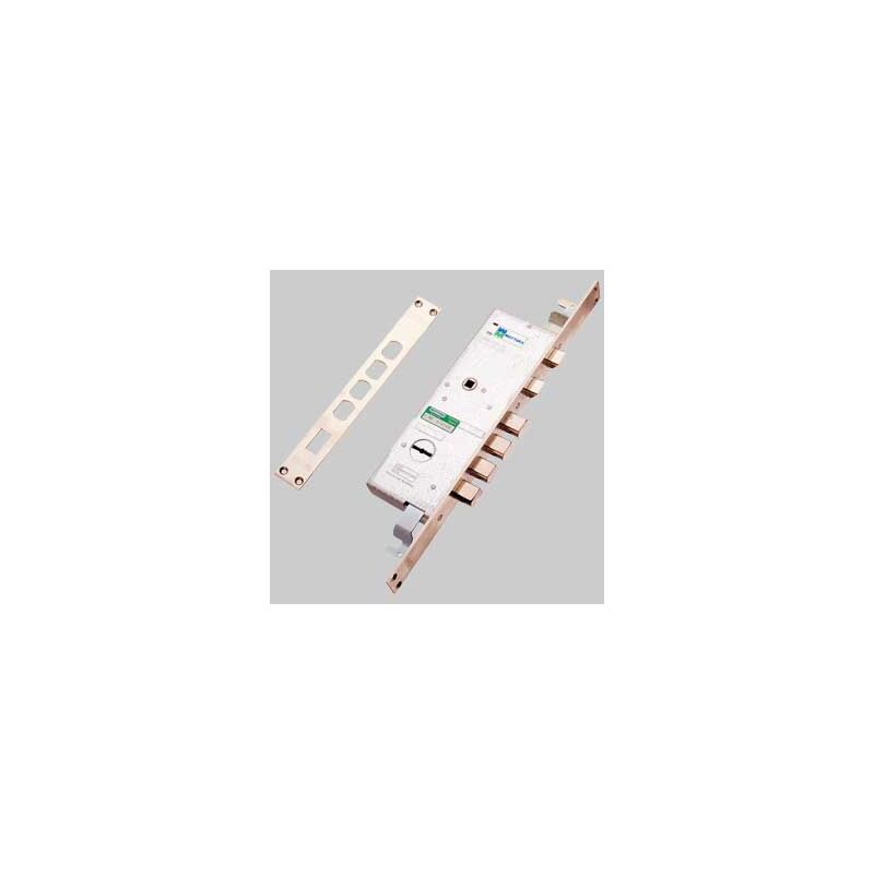 Triplice con mezzo giro azionato da chiave, quadro maniglia mm.8 ed elettricamente. N. 4 chiavistelli con corsa mm.18 a due mandate, corsa aste mm.17. Reversibile. Alimentazione 12V. Scatola mm.234x78x30. Ad infilare.