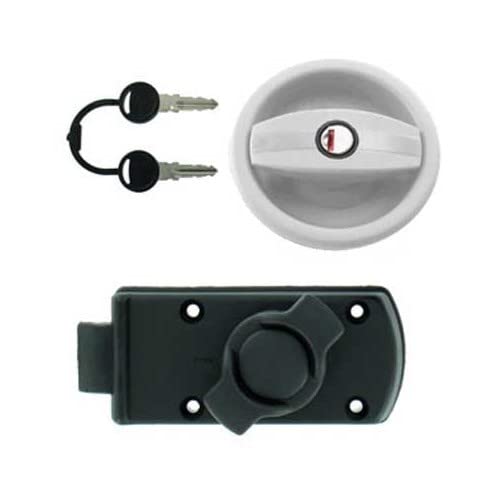 Serratura esterna bianca con serratura interna nera a bottone per porta caravan con apertura a sinistra + barilotto e chiavi