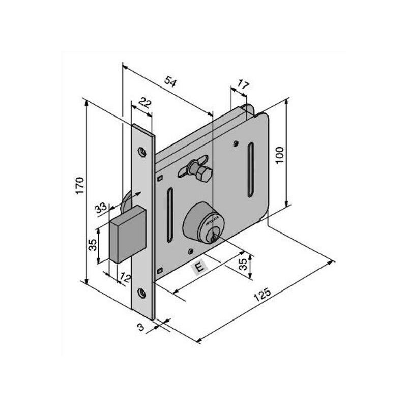 Serratura cancelli/porte ferro infilare Acciaio zincato tropicalizzato 1 mandata e mezza - Scrocco - Pomolino svitabile Scatola mm 125x100 - Frontale mm 22x170 Entrata mm 50 - Cilindro serie 605.00.00.1