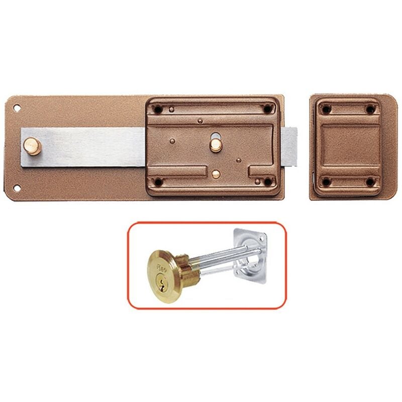 Cilindro esterno staccato, scrocco incorporato, pomolo sblocca catenaccio interno. dotazione 3 chiavi.5 1/2 mandate - e 50