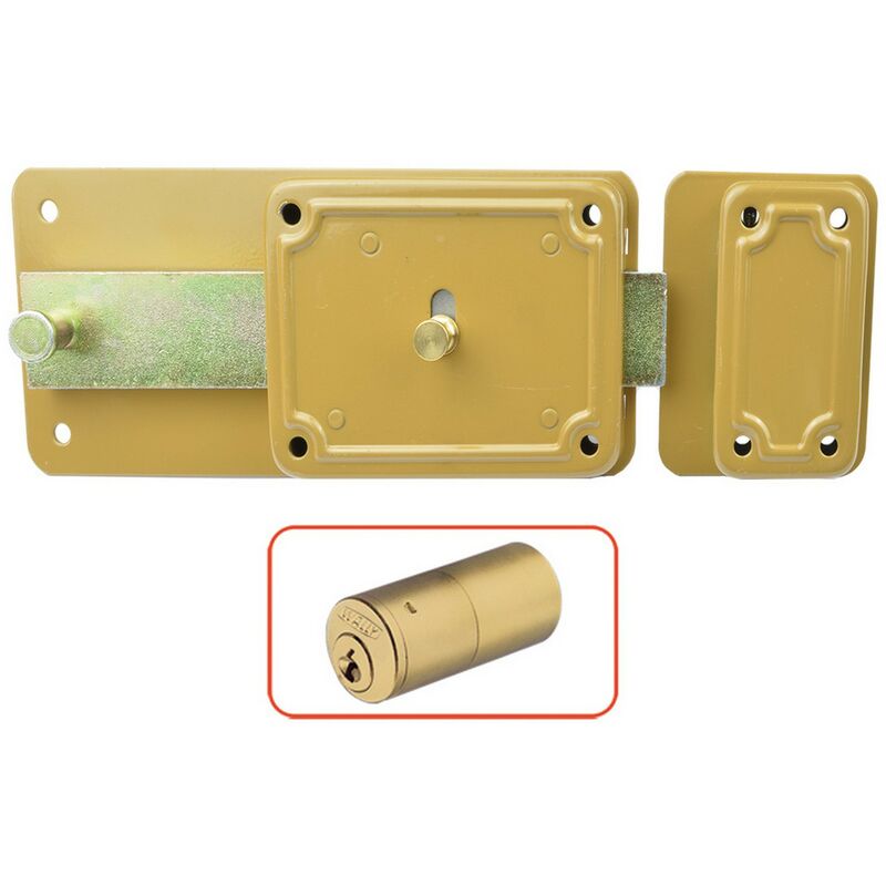 Cilindro fisso esterno. pomolo interno, cilindro a 5 pistoncini (2 antimanipolazione). scatola a finitura verniciata elettrostaticamente con polvere epossidica color nocciola mm. 209x90. completa di 3 chiavi in ottone nichelato, bocchetta, borchia e viti