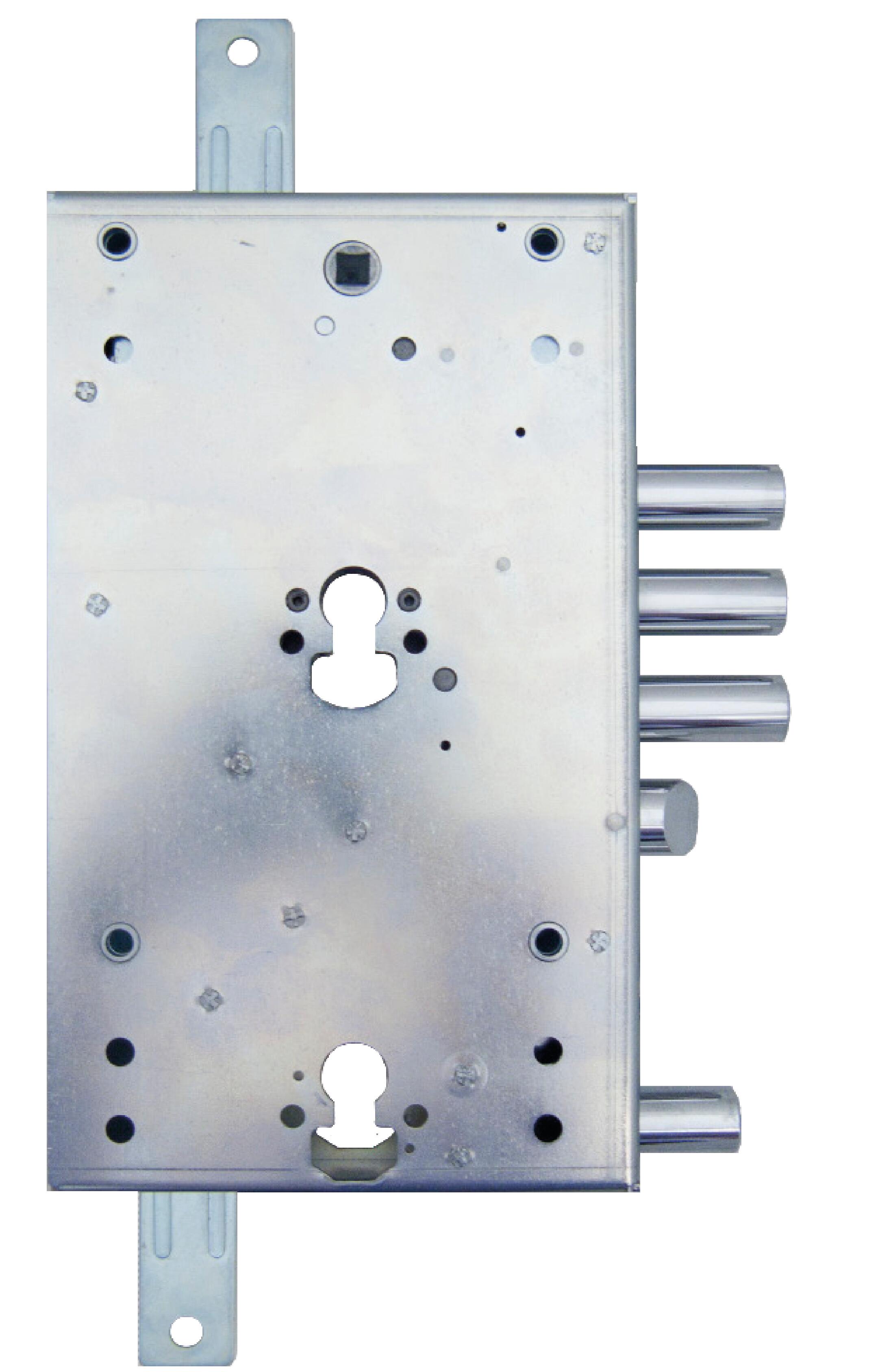 RICAMBIO DIERREDOPPIA SERRATURAapplicare triplice a cilindro europeoad ingranaggiDISPOSITIVOANTI-EFFRAZIONELOCK BLOCKING SYSTEMSOLO SUL CILINDRO SUPERIORELa serratura superioreaziona i catenacci e lo scrocco. La maniglia aziona lo s