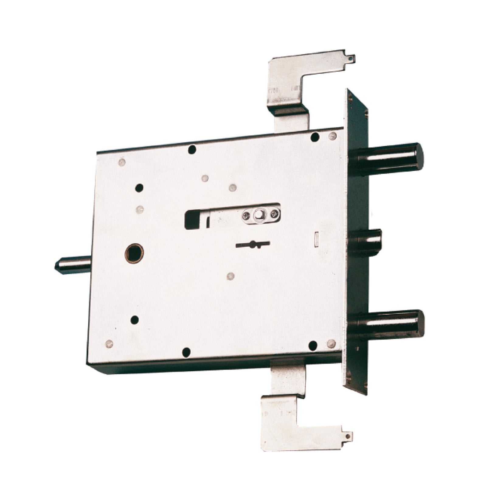 SERRATURA DOPPIA MAPPA INFILARE TRIPLICE 4 Mandate e scrocco azionato da quadromaniglia e chiave Piastra frontale mm. 190 x 43 - E - 65 - Mano - DX - N° Cat. - 4 catenacci più scrocco - Int. cat. - 27 - Chiusura - triplic