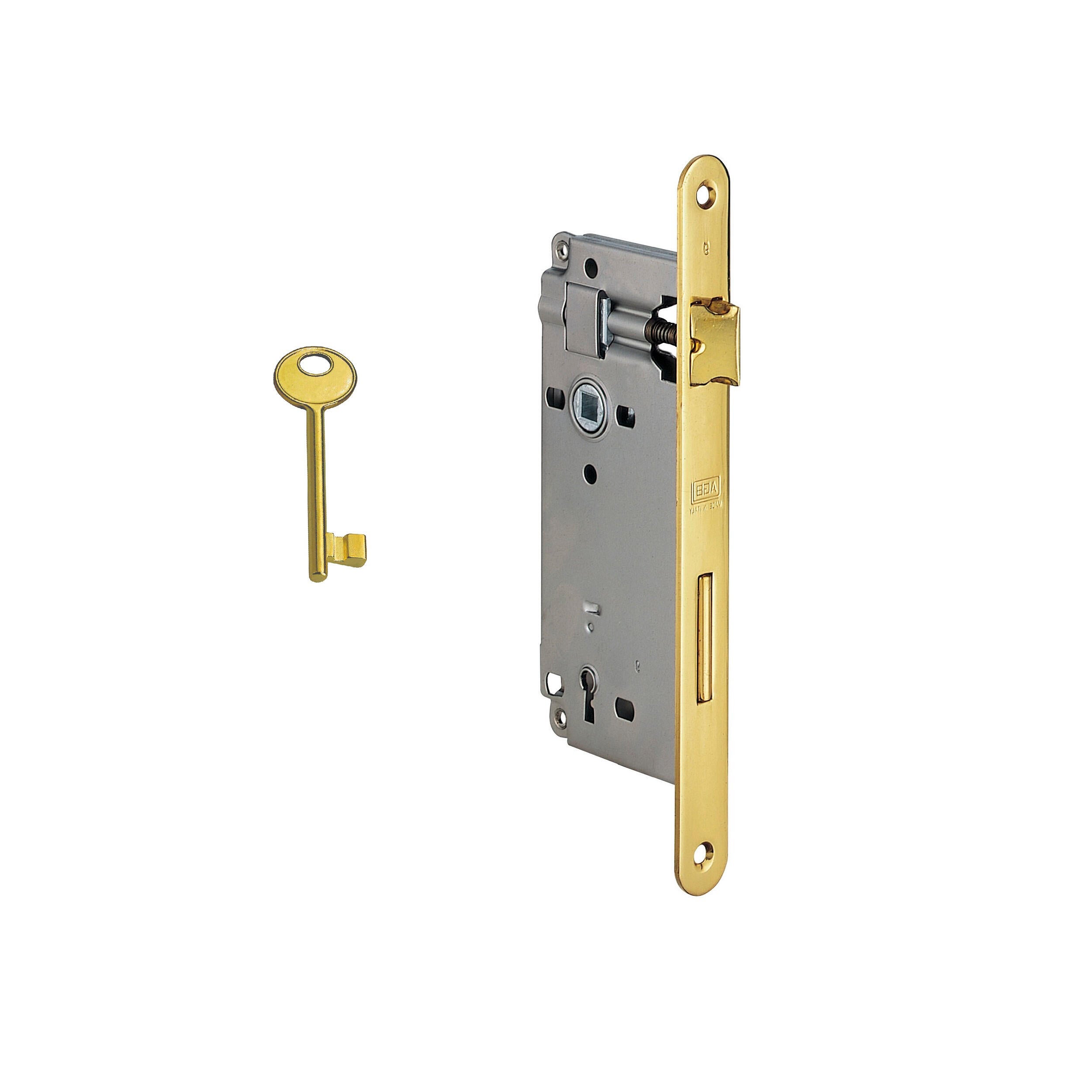 SERRATURAPATENT PICCOLABordo tondo senza incontroFront. 20 - E - 35 - Tipologia - Serratura Patent - Frontale - 20 X 188 - Bordo - Tondo - Int. man. - 70 - Chiusura - Scrocco più catenaccio - Finitura - Ottonato - C