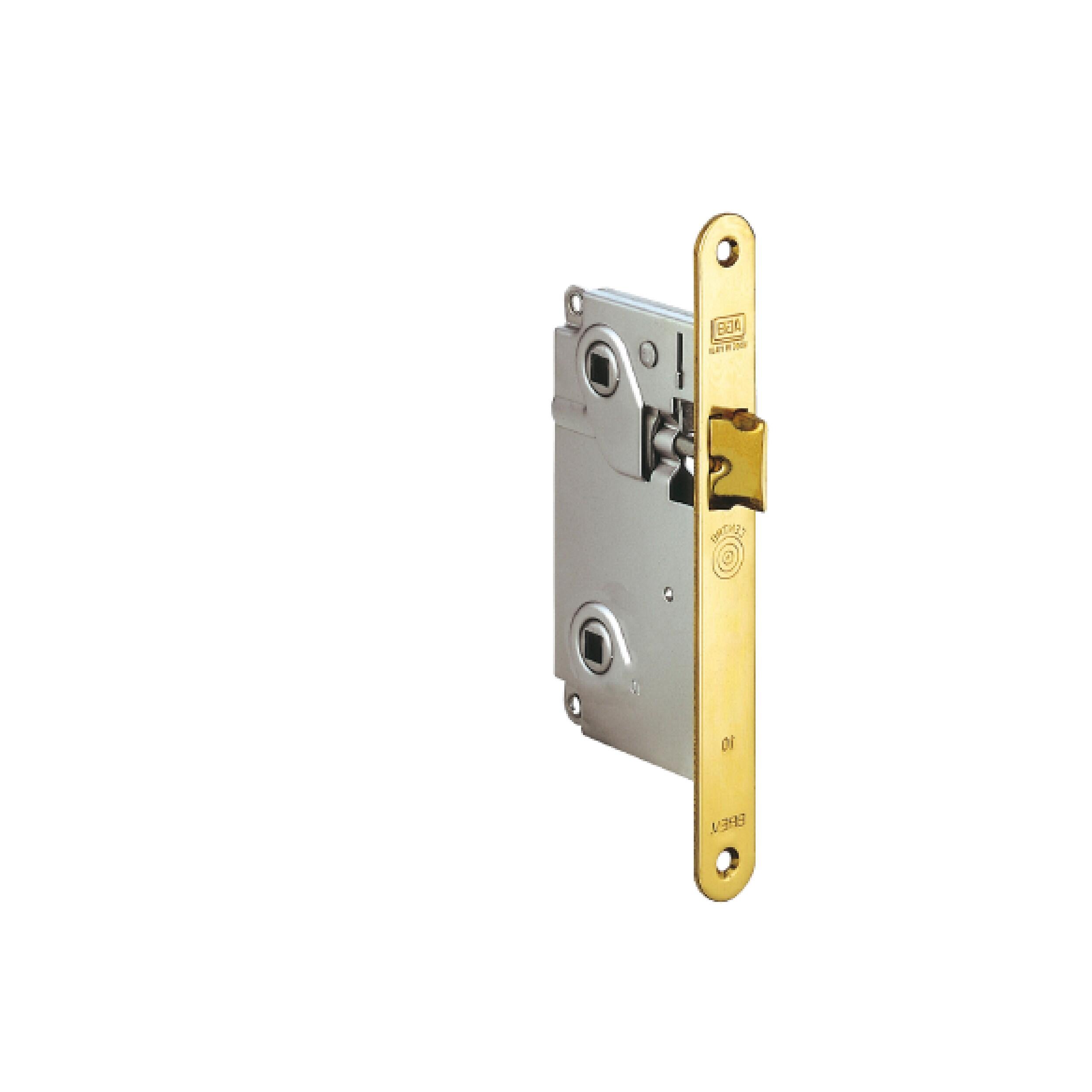 SERRATURAPATENT CENTROBAGNOSolo scrocco doppio quadro - E - 50 - Tipologia - Serratura Patent Bagno - Frontale - 22 x 196 - Bordo - Tondo - Int. man. - 85 - Chiusura - Solo scrocco - Finitura - Cromo satinato - Cassa - 75 x 132