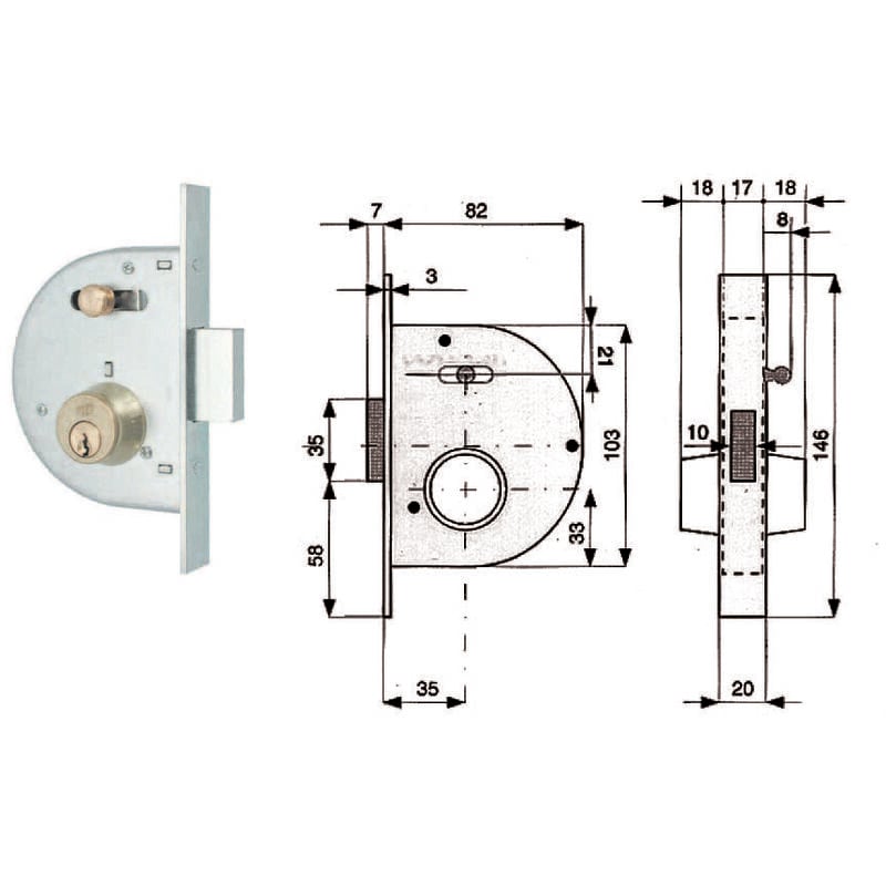 Scatola e frontale in acciaio zincato, catenaccio con scrocco incorporato e pomolino in acciaio a 1 mandata, con coppia di cilindri conici fissi ottone ø mm.25/30