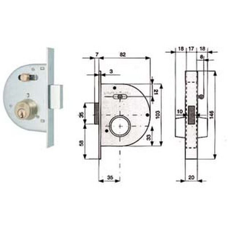 Scatola e frontale in acciaio zincato, catenaccio con scrocco incorporato e pomolino in acciaio a 1 mandata, con coppia di cilindri conici fissi ottone ? mm.25/30