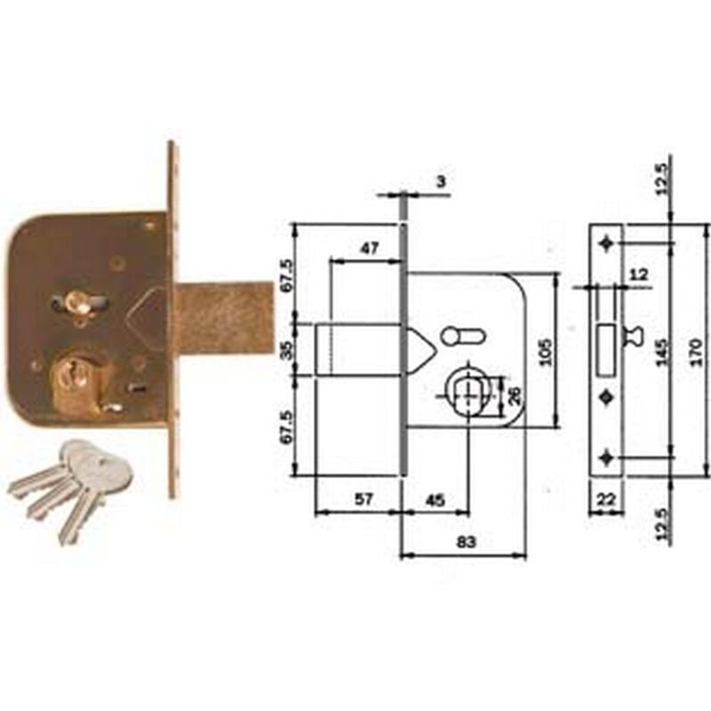 Scatola e frontale in acciaio tropicalzzato, catenaccio mm.10 prolungato a 1 mandata con scrocco incorporato, richiamo scrocco tramite chiave o pomolo interno, con cilindro tondo sfaccettato ? mm.26 da mm.56 centrato (28x28) e 3 chiavi