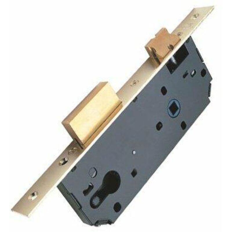 Scatola completamente chiusa in acciaio verniciato con fori passanti a norma din per l'applicazione di rosette di sicurezza, frontale ed incontro con bordo quadro in acciaio ottonato lucido, catenaccio mm.20 a 2 mandate con scrocco separato reversibile, r