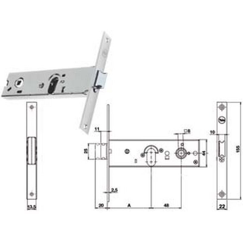 Per fascia stretta, frontale in acciaio inox, scatola in acciaio zincato, catenaccio con scrocco incorporato reversibile con richiamo tramite chiave o quadro maniglia da mm.8 passante, funzionante con cilindro ovale non compreso,scatola mm.44h., interasse