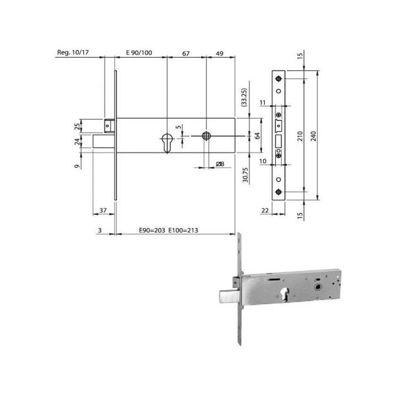 Serratura zincata infilare fasce alluminio Catenaccio 3 mandate Scrocco reversibile quadro 8 Cilindro non incluso Scatola 64 - Frontale inox 22x240 -Entrata 90/100