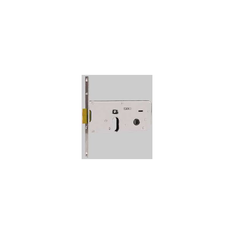 2 Mandate da 10 mm con scrocco incorporato. Chiusura laterale. Funzionante con cilindro ovale (Non incluso). Altezza scatola 64 mm. Richiamo scrocco con chiave o quadro maniglia 8 mm. In dotazione viti per fissaggio cilindro.