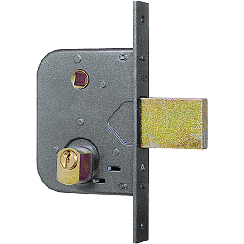 Catenaccio prolungato. Una mandata, scrocco incorporato. Quadro maniglia mm 8. Dotata di cilindro, tre chiavi,due ghiere