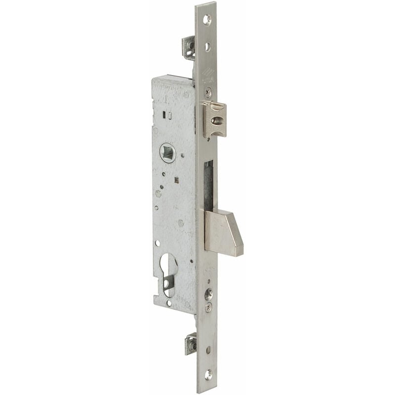 Scatola in acciaio con rivestimento in zinco. Foro cilindro europeo. Con scrocco e catenaccio basculante nichelato, 1 mandata. Scorcco regolabile da 11 a 17 mm. Frontale 22 mm acciaio inox, interasse 85 mm. Predisposizione per chiusure supplementari. Dotazione vite fissaggio cilindro, borchie, perni filettati fissaggio prolunghe. Senza cilindro.