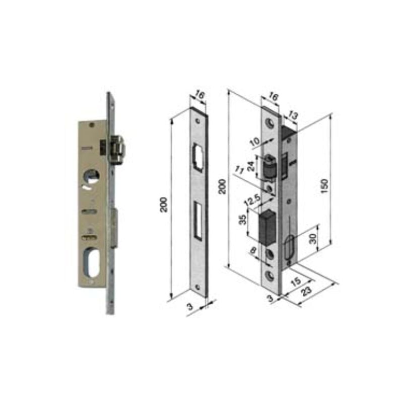 Mm.15 (11015010) per montante, scatola in acciaio nichelato, frontale ed incontro da mm.16x3x200h. in acciaio nichelato, catenaccio 1 mandata da mm.12,5 rullo separato regolabile in ottone, funzionante con cilindro ovale non compreso Categoria merceologica: Serrature, chiusure di sicurezza e accessori - Sicurezza - Serrature per montanti da infilare