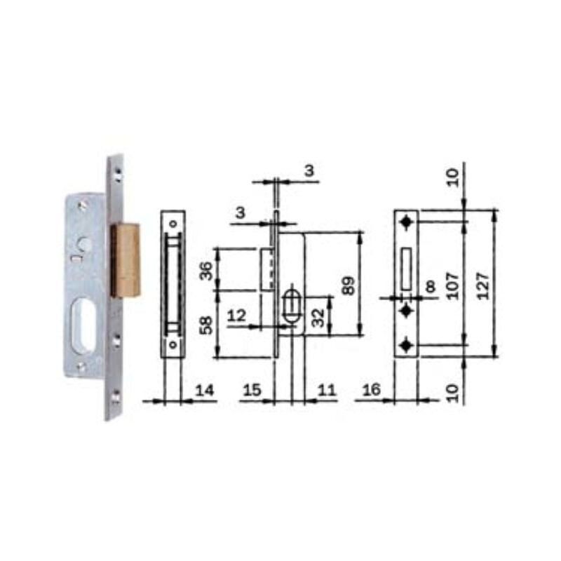 Mm.15 (7601510) in acciaio zincato per montante a scatola aperta, frontale da mm.16x3x127h. in acciaio cromato, catenaccio mm.3 prolungato ad 1 mandata da mm.9, funzionante con cilindro ovale non compreso Categoria merceologica: Serrature, chiusure di sicurezza e accessori - Sicurezza - Serrature per montanti da infilare