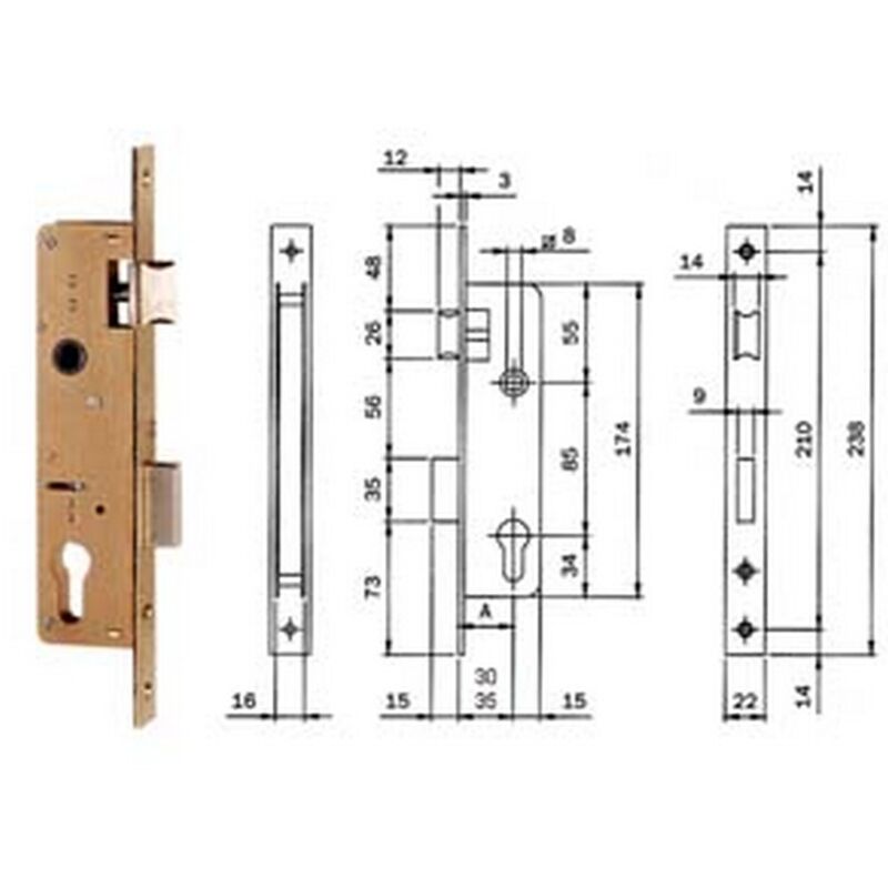 Scatola aperta e in acciaio tropicalizzato, frontale con bordo quadro in acciaio ottonato satinato, catenaccio mm.15 a 1 mandata con scrocco separato reversibile, richiamo scrocco tramite chiave o quadro maniglia da mm.8 passante, funzionante con cilindro