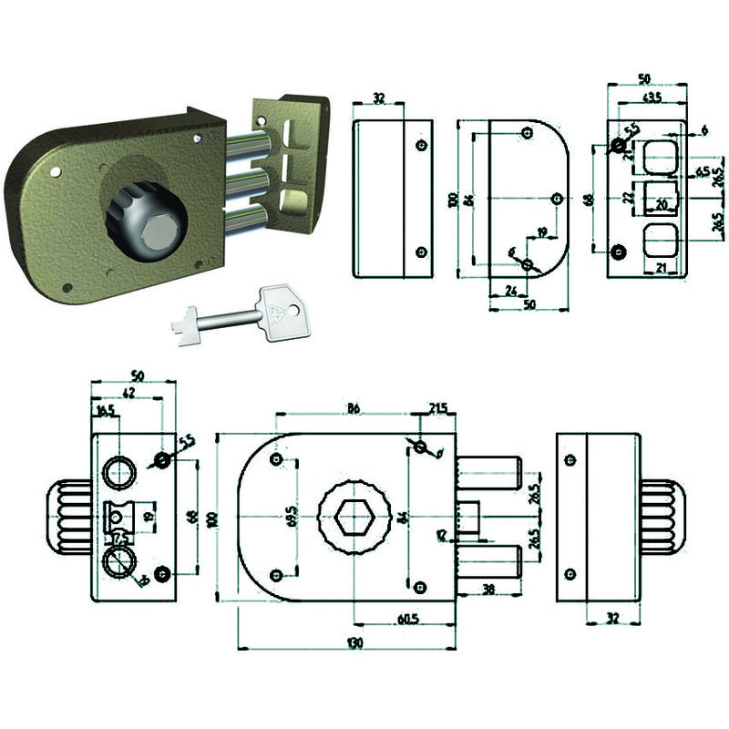 Serratura con cilindro a pompa senza scrocco - applicazione: planare - 3 catenacci - comando interno: pomolo - finitura verniciata - 1 punto di chiusura - corsa catenacci mm.38 - lunghezza cilindro mm.60 - accessori inclusi: ferrogliera, mostrina esterna, viti