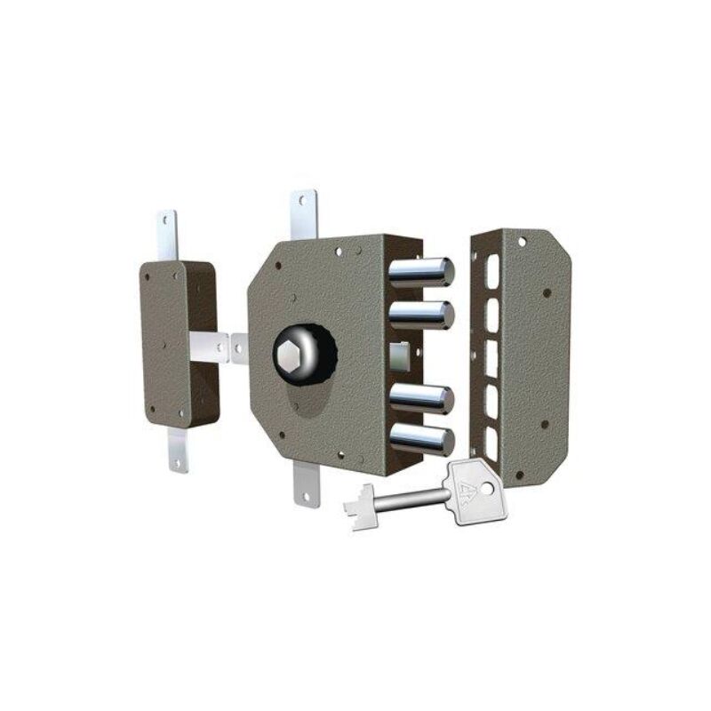 Serratura legno applicare 3350p cr C.pompa m4+pomolo tripl+scr e.mm 60 dx con cilindro a pompa sul lato esterno e calotta sul lato interno. scrocco. chiusura quintupla con catenaccio a 4 pistoni e 4 mandate, corsa mm. 38, e predisposizione fissaggio aste e deviatore. scatola mm. 130x164. bocchetta mm. 49x164. in acciaio verniciato. in dotazione: 3 chiavi, 1 deviatore aste, 1 ferrogliera, 1 mostrina e viti.