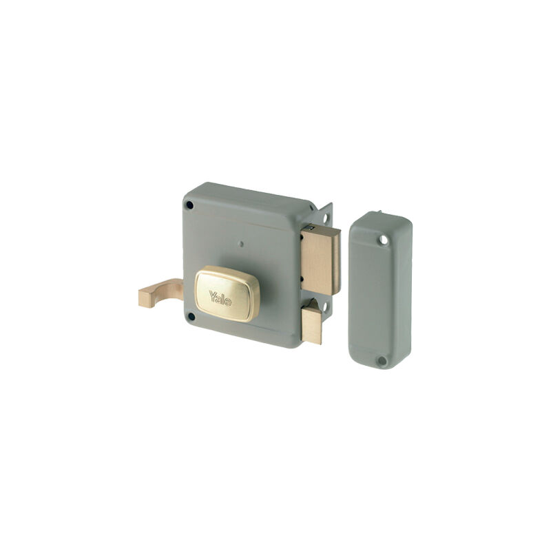 Con cilindro esterno staccato. Scrocco azionato dall'esterno mediante chiave e dall'interno mediante tirante. Pomolo interno. Chiusura a catenaccio a 2 mandate azionato mediante pomolo dall'interno e chiave dall'esterno. Scatola Mm. 80x85. Bocchetta Mm. 32x85. In acciaio verniciato. In dotazione: 3 chiavi piatte e 1 bocchetta.