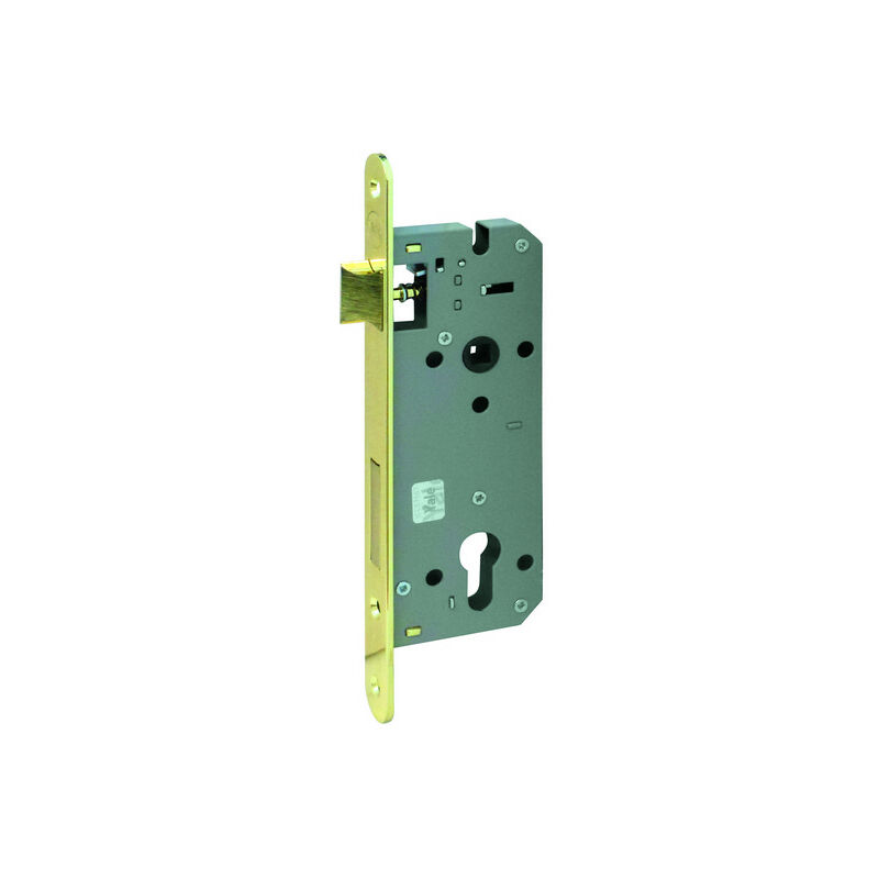 Serratura da infilare. Scrocco reversibile, quadro mm. 8,NLdistanza mm. 85, bordo tondo, con contropiastra.
