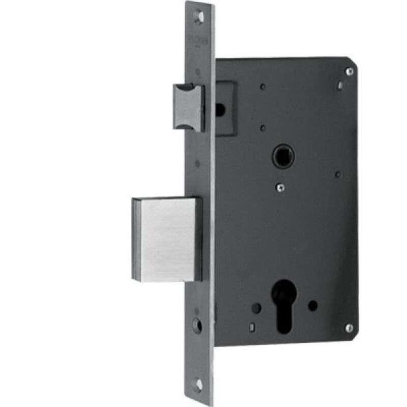 Per cilindro sagomato. Scrocco reversibile. Chiusura con catenaccio a 2 mandate. Quadro maniglia Mm. 8. Frontale con bordo quadro da Mm. 22x238. Altezza scatola Mm. 174,40. In dotazione: viti di fissaggio.