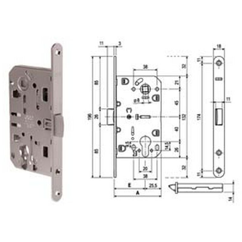 Con foro cilindro - quadro maniglia mm.8 - interasse mm.85 - frontale bordo tondo mm.18 - serratura per porte interne a filo o a battente con scrocco centrale in poliammide che le conferisce straordinaria silenziosit? in chiusura mantenendo l'affidabilit