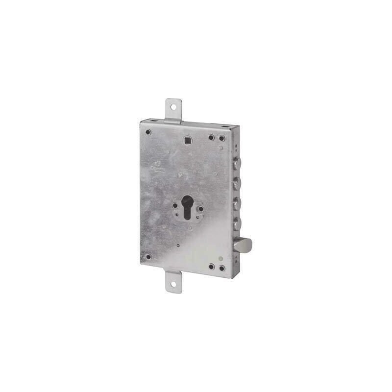 Per cilindro sagomato. Scrocco reversibile, azionabile da chiave o maniglia. Chiusura triplice con catenaccio a 4 pistoni e 2 ma