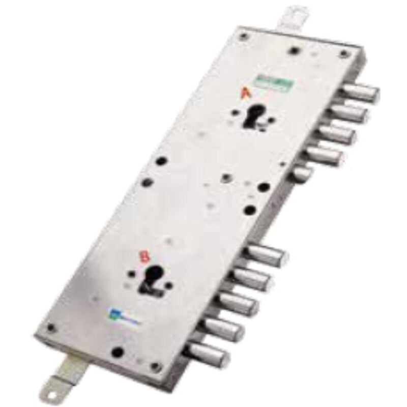 DOPPIO F.SAGOM M2 TRIPL+SCR IP.MM 28 E.MM 63 SXPer doppio cilindro sagomato attacco Mottura ad apertura dipendente (va azionato prima il clindro superiore e poi quello inferiore). Interasse cilindri Mm. 206,5. Il cilindro superiore aziona scrocco, azionabile da chiave o maniglia, e una chiusura triplice con catenaccio a 4 pistoni e 2 mandate, corsa Mm. 29, e predisposizione per fissaggio aste, corsa Mm. 20. Il cilindro inferiore aziona una chiusura con catenaccio a 5 pistoni e 2 mandate, corsa Mm. 29, e blocco serratura superiore. Quadro maniglia Mm. 8, interasse Mm. 85. Scatola Mm. 136x412,5. In acciaio zincato.