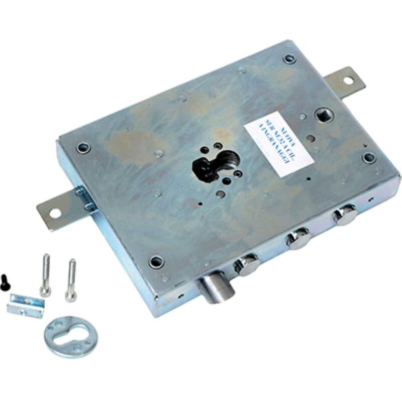 Per cilindro sagomato. Scrocco azionabile da chiave o maniglia. Chiusura triplice con catenaccio a 4 pistoni e 4 mandate, corsa Mm. 40, e predisposizione per fissaggio aste, corsa Mm. 18. Quadro maniglia Mm. 8, interasse Mm. 85. Scatola Mm. 142(150,5)x206. In acciaio zincato. In scatola.