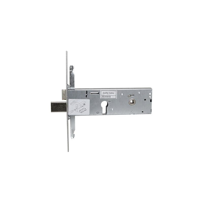 Iseo Serratura metallo infilare 96310 Per cilindro sagomato Scocco reversibile Per cilindro sagomato. Scrocco separato reversibile e regolabile. Chiusura triplice con catenaccio a 3 mandate e agganci aste a vite. Quadro maniglia Mm. 8. Frontale in acciaio zincato con bordo quadro da Mm. 22x240. Altezza scatola Mm. 64. In dotazione: 2 ghiere, coppia spessori sottofrontale, grano interno per fissaggio cilindro e viti fissaggio.