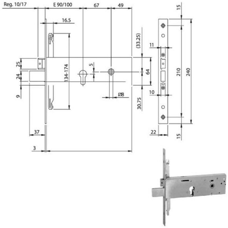 Serratura metallo infilare 96310 iseo Serratura metallo infilare 96310 iseo b.q zinc f.mm 22 f.sag.trip+scr+q8 h.mm 64 e.mm100 Caratteristiche Tecniche: - Serratura in metallo ISEO B.Q zincata, da infilare con misure di 22mm di larghezza e 64mm di altezza. Dotata di fermo sagomato, triplice chiusura e scrocco. Include 8 chiavi. Dimensioni esterne di 100mm.