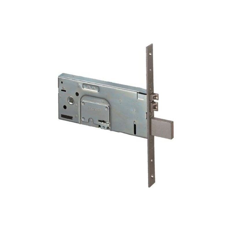 Serratura metallo infilare elettrica 17352 cisa B.q zinc f.mm 22 dm m4+scr h.mm 78 e.mm 100 a doppia mappa. fermo a giorno e scrocco reversibile autobloccante. scrocco e pistone regolabili da mm. 12 a mm. 18. chiusura con catenaccio a 4 mandate. quadro maniglia mm. 8. frontale in acciaio zincato con bordo quadro da mm. 22x240. altezza scatola mm. 78. in dotazione: 2 bocchette per chiave e 3 chiavi.