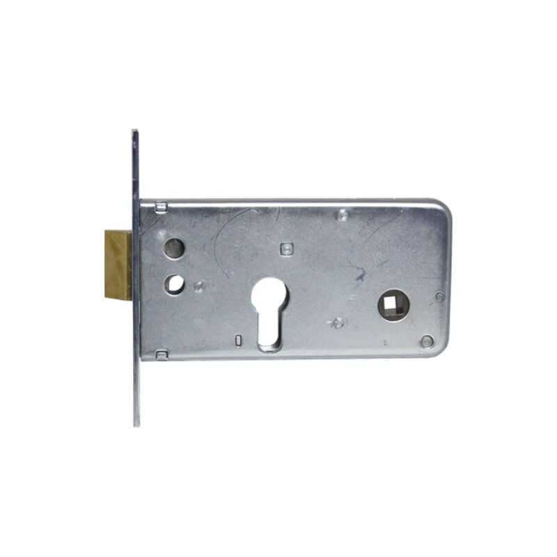 Per cilindro sagomato. Scrocco con catenaccio incorporato. Chiusura a 1 mandata Mm. 11. Quadro maniglia Mm. 8. Frontale in acciaio zincato con bordo quadro da Mm. 22x130. Scatola altezza Mm. 72. In dotazione: vite di fissaggio cilindro.