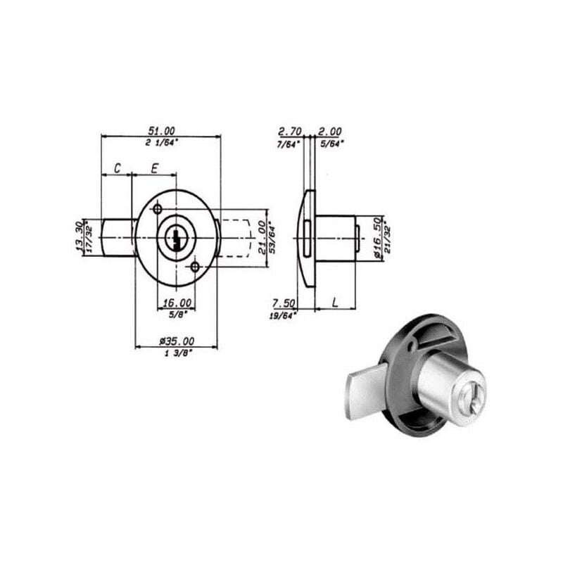 Serratura resina colore bianco Applicazione antine 2 uscite chiave - Rotazione 360^ Chiusura catenaccio laterale corsa mm 13 Cilindro a spine mm 16,5- Cifratura unica KA Dimensioni mm 35 2 chiavi