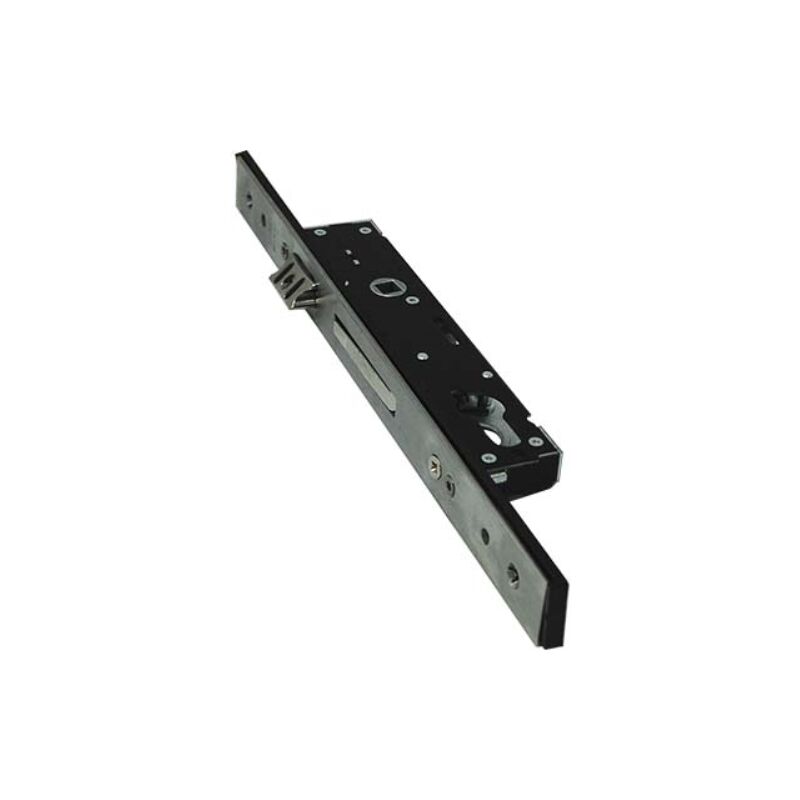 Per cilindro sagomato. Scrocco reversibile. Chiusura con catenaccio rotante a 1 mandata. Quadro maniglia Mm. 8. Frontale in acciaio cromato con bordo quadro da Mm. 25x300. Altezza scatola Mm. 175, con uno spessore di Mm. 15. In dotazione: viti di fissaggio per cilindro.