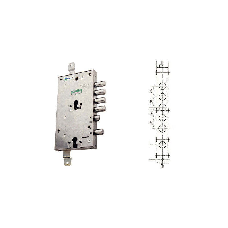 Serrature triplice con doppio cilindro. blocco serratura superiore. serratura superiore con mezzo giro ø 20 azionato da cilindro superiore e inferiore e maniglia ø 8, entrata cilindro e maniglia 63 mm., multifunzione 2 mandate. serratura inferiore con c