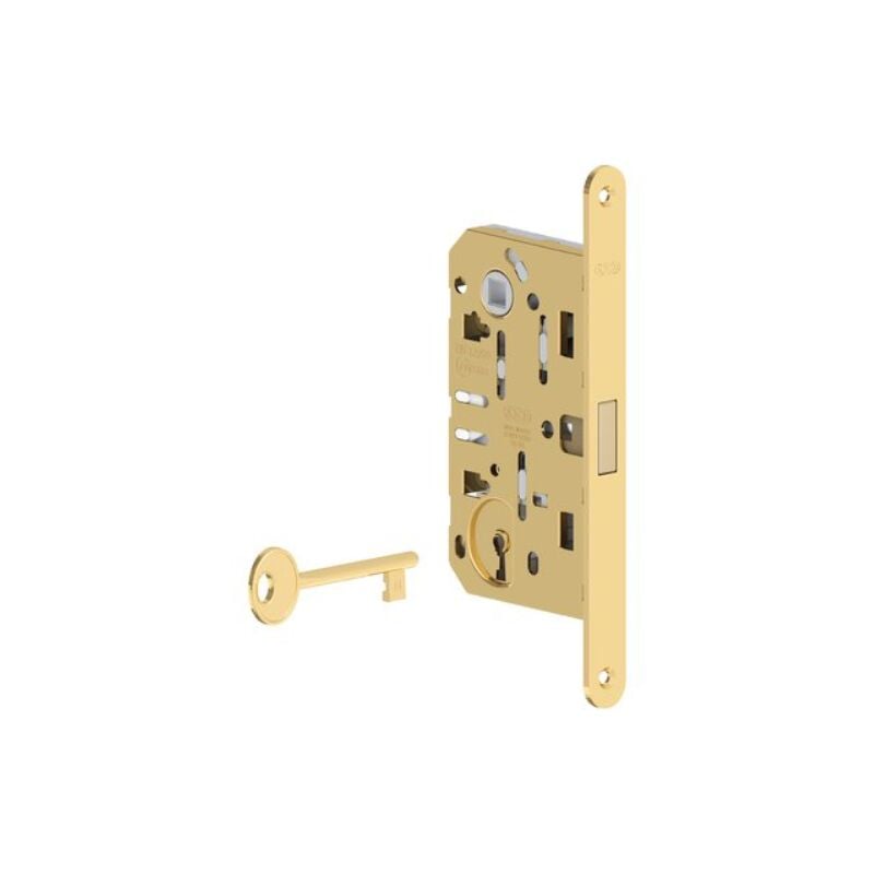 Serratura patent b.tondo ottonato polaris agb I.mm 90 f.mm 18 e.mm 50 a movimento magnetico. concepita con innovativi materiali in grado di assicurare il perfetto funzionamento della serratura anche nelle situazioni ambientali più estreme (umidità, polveri, agenti chimici). scrocco magnetico, con richiamo quadro maniglia mm. 8. chiusura con catenaccio a 1 mandate. frontale da mm. 18x196. altezza scatola mm. 132. in dotazione: 1 chiave patent.