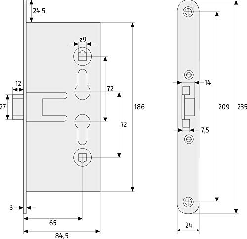Serratura 9 mm | caso + chiavistello: Acciaio zincato | DIN destra + sinistra