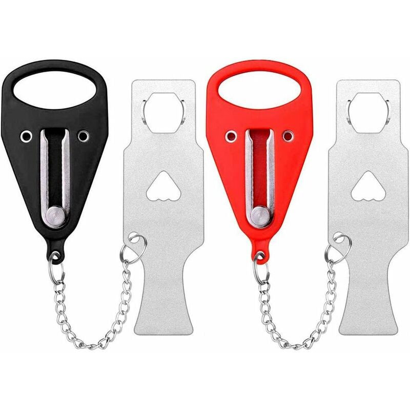 Serratura portatile che si installa in pochi secondi senza bisogno di attrezzi. Il manuale di istruzioni contiene fornisce ulteriore sicurezza e privacy. La serratura della porta portatile non può essere aperta facilmente anche se altri hanno la chiave fuori dalla stanza quando dormi e riposi. Pezzo di ferro 5,12*1,6 *0,47 pollici, lunghezza catena intermedia 4,7 pollici, rosso 2,16*0,39 pollici . ti dà maggiore sicurezza, protezione e privacy. Usalo a casa o portalo con te quando viaggi, soggiorni in appartamento, studenti in hotel, blocco della scuola, ottimo anche se soggiorni in un AirBNB o in un altro noleggio a breve termine. Il blocco di sicurezza è dotato con una borsa tascabile per il trasporto. Ideale per affittare una stanza, viaggiare e andare in vacanza. Sono tutti fatti a mano e alcune imperfezioni sono normali. Non pregiudica il normale utilizzo. Installa con cura la serratura della porta, altrimenti sarebbe facile piegarsi e rompersi. E la serratura della porta è la