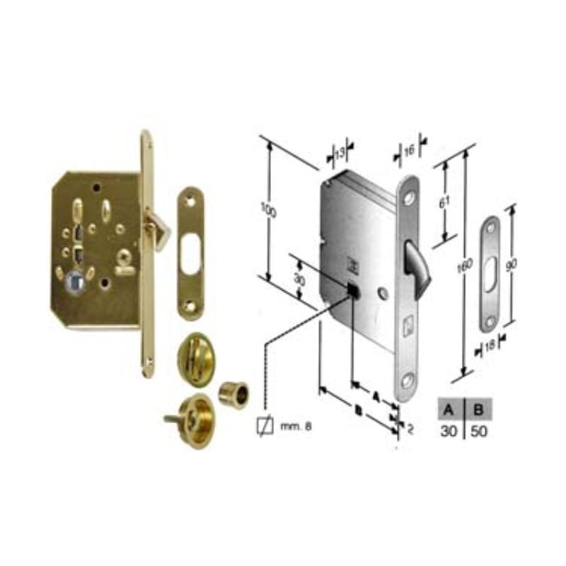 Mm.50 frontale e incontro ottone lucido scatola in acciaio zincato, catenaccio a gancio rientrante, con quadro maniglia da mm.8 passante, funzionante con coppia maniglie ø mm.48 Categoria merceologica: Serrature, chiusure di sicurezza e accessori - Sicurezza - Serrature a gancio per porte scorrevoli...