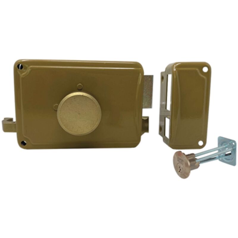 Cilindro staccato esterno, pomolo interno, scrocco. Cilindro a 5 pistoncini (2 antimanipolazione). Scatola a finitura verniciata elettrostaticamente con polvere epossidica color nocciola. Completa di 3 chiavi in ottone nichelato, bocchetta, borchia e viti di fissaggio. In scatola.
