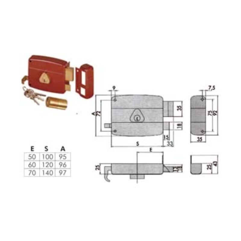 Mm.50 sx (50121502) scatola e bocchetta in acciaio verniciato, catenaccio 2 mandate con cilindro interno e scrocco separato, tirante interno in ottone, cilindro fisso, dotazione: 3 chiavi Categoria merceologica: Serrature, chiusure di sicurezza e accessori - Sicurezza - Serrature per portoncino da applicare