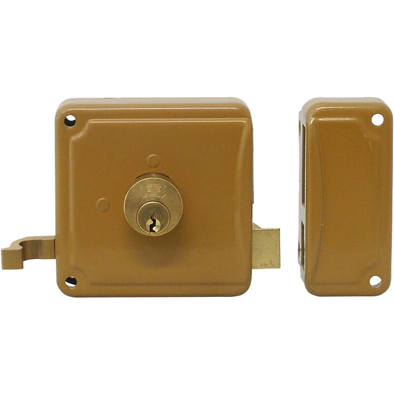 Cilindro doppio fisso: interno a 3 pistoncini ed esterno a 5 pistoncini. Scrocco e catenaccio. Scatola a finitura verniciata elettrostaticamente con polvere epossidica color nocciola. Completa di 3 chiavi in ottone nichelato, bocchetta, borchia e viti di fissaggio. In scatola.