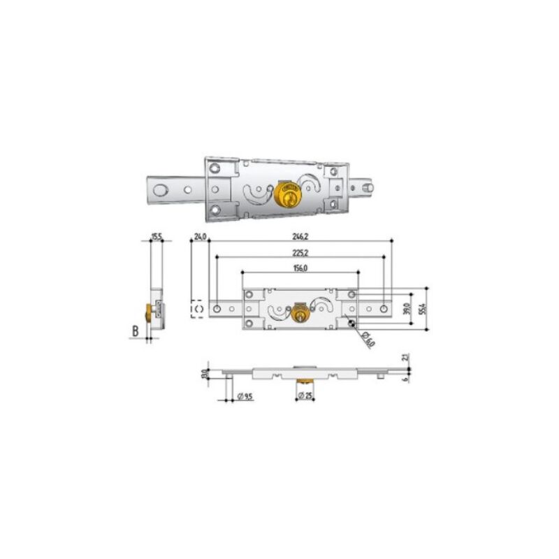 Serratura PREFER per serrande avvolgibili, ambidestra, chiusura centrale ad aste diritte, cilindro tondo diametro mm.25x5.5, scatola mm.156x56, interasse fori mm.138x39.